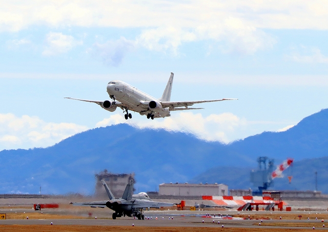 米海軍 P-8A 海上哨戒機 ポセイドン(嘉手納基地、三沢基地)、LC、572番機がタッチアンドゴーして旋回(2周目) |