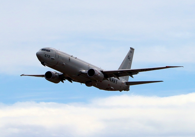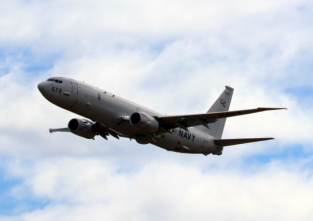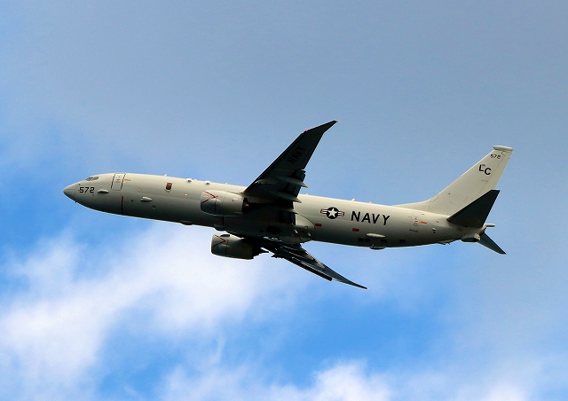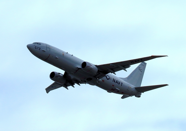 米海軍 P-8A 海上哨戒機 ポセイドン(嘉手納基地、三沢基地)、LC、572番機が旋回(2周目) |