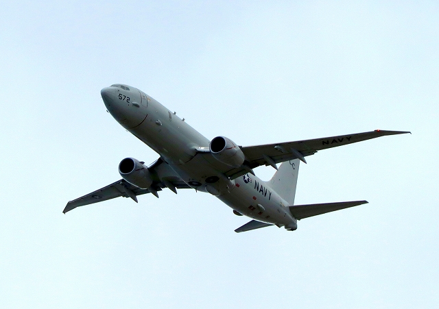 米海軍 P-8A 海上哨戒機 ポセイドン(嘉手納基地、三沢基地)、LC、572番機が旋回(4周目) |