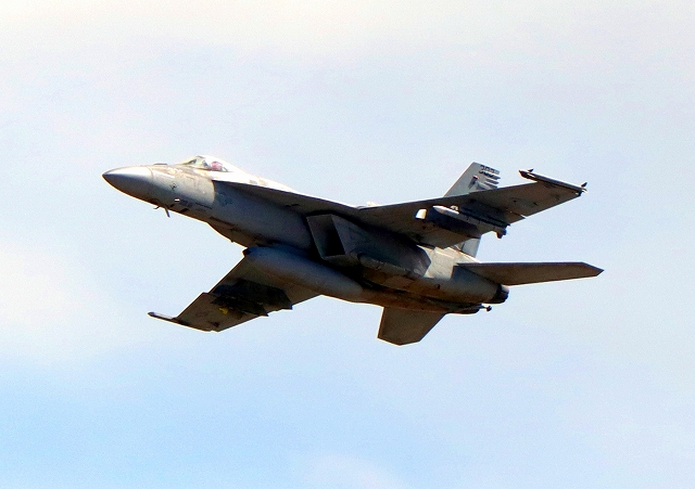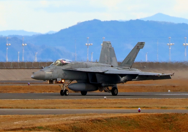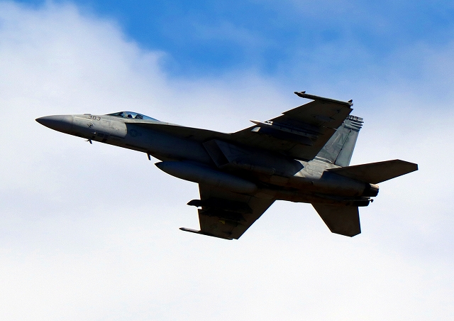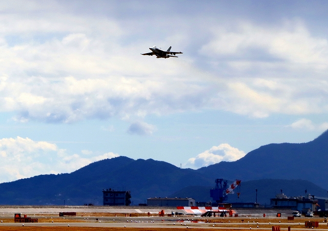 米海軍艦載機 F/A-18E スーパーホーネット 戦闘攻撃機(岩国基地)、NF、303番機が離陸 |