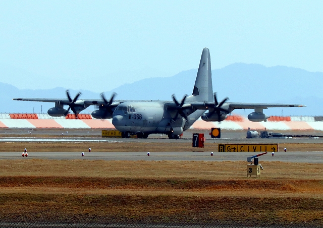 米海兵隊 KC-130J 空中給油機 スーパーハーキュリーズ(岩国基地)、QD 8066番機が着陸 |