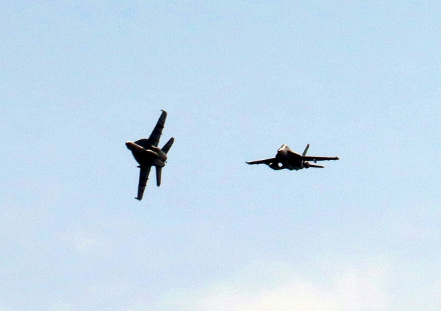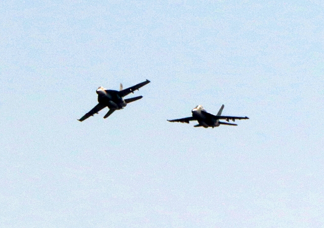 米海軍艦載機 F/A-18F スーパーホーネット 戦闘攻撃機(岩国基地)、NF、110番機、107番機が帰還 |