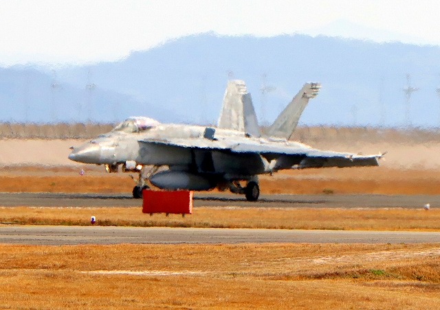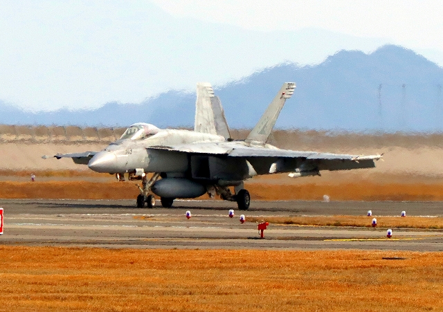 米海軍艦載機 F/A-18E スーパーホーネット 戦闘攻撃機(岩国基地)、NF、301番機が着陸 |