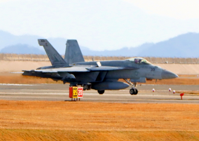 米海軍艦載機 F/A-18E スーパーホーネット 戦闘攻撃機(岩国基地)、NF、303番機が着陸 |