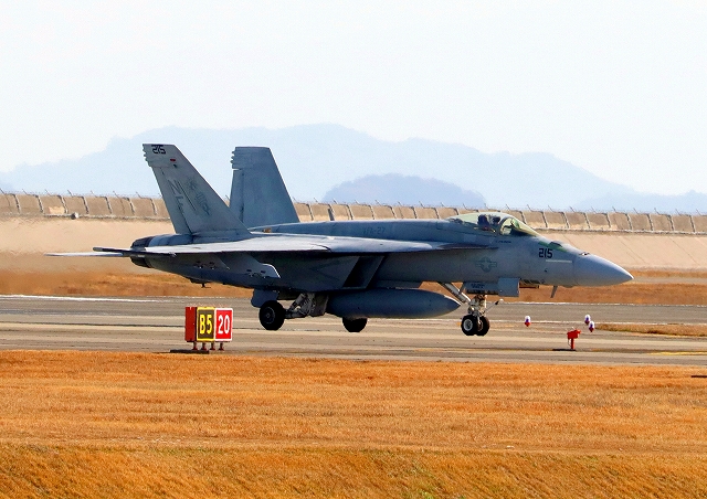 米海軍艦載機 F/A-18E スーパーホーネット 戦闘攻撃機(岩国基地)、NF、215番機が着陸 離陸は撮影失敗。 |
