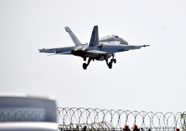 米海軍艦載機 F/A-18E スーパーホーネット 戦闘攻撃機(岩国基地)、NF、306番機が着陸 |