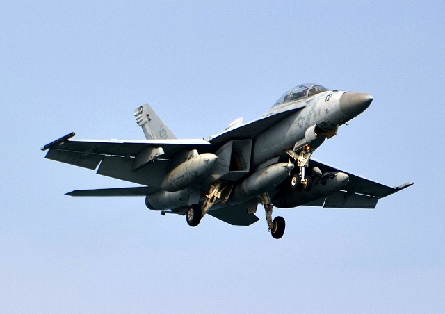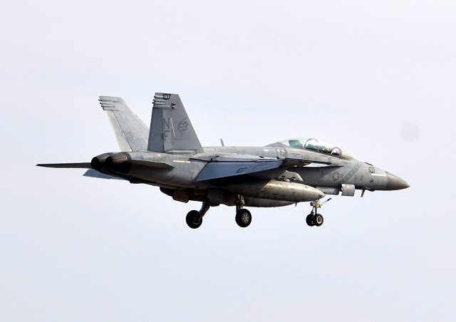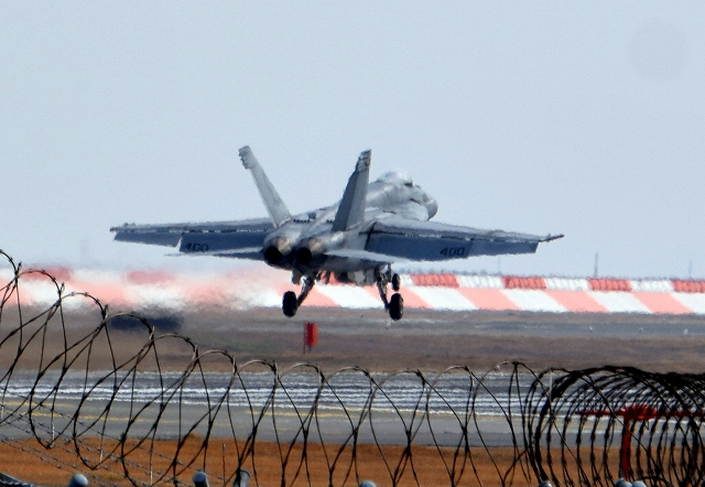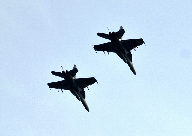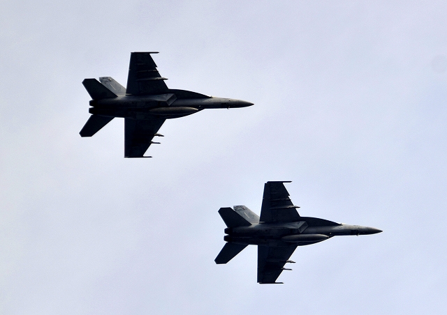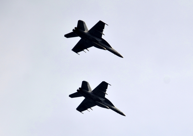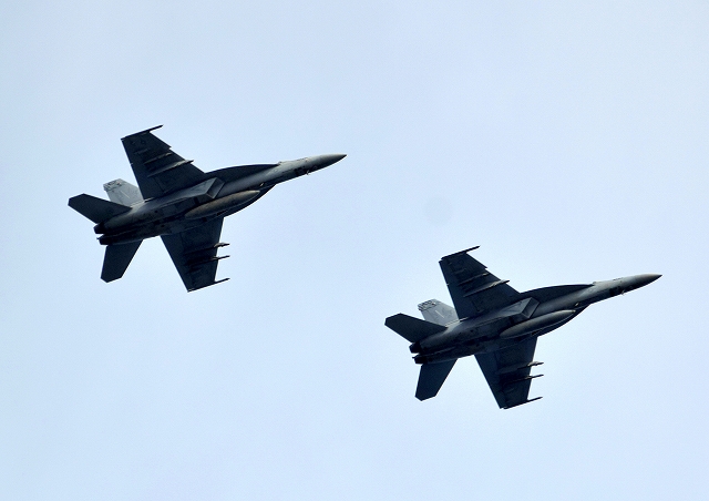 米海軍艦載機 F/A-18E スーパーホーネット 戦闘攻撃機(岩国基地)、NF、400番機、402番機が2機編隊で帰還 |