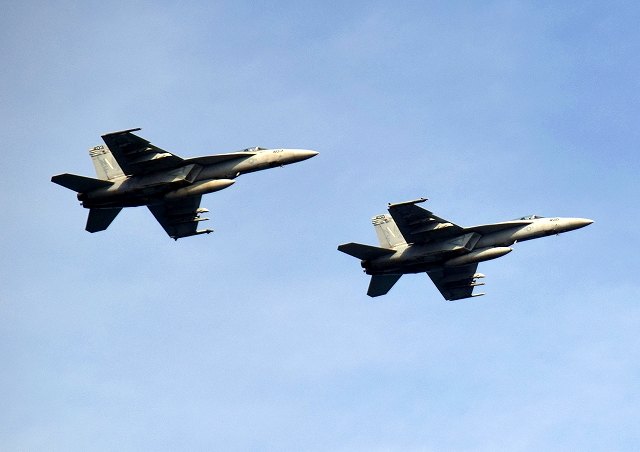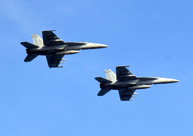 米海軍艦載機 F/A-18E スーパーホーネット 戦闘攻撃機(岩国基地)、NF、400番機、403番機が2機編隊で帰還 |