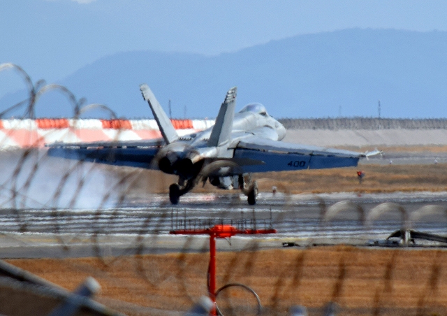 米海軍艦載機 F/A-18E スーパーホーネット 戦闘攻撃機(岩国基地)、NF、400番機が着陸