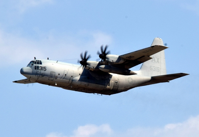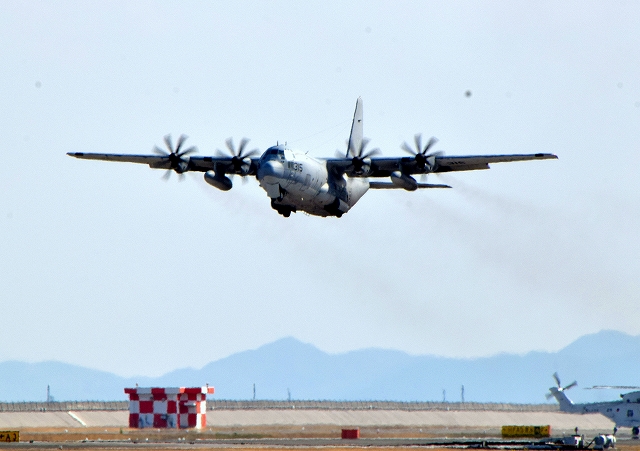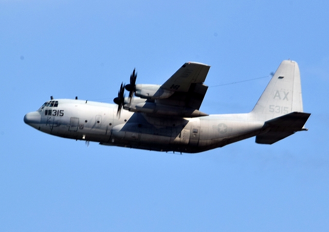 米海兵隊 KC-130J 空中給油機 スーパーハーキュリーズ(米本土海兵隊基地)、AX 5315番機が離陸 |