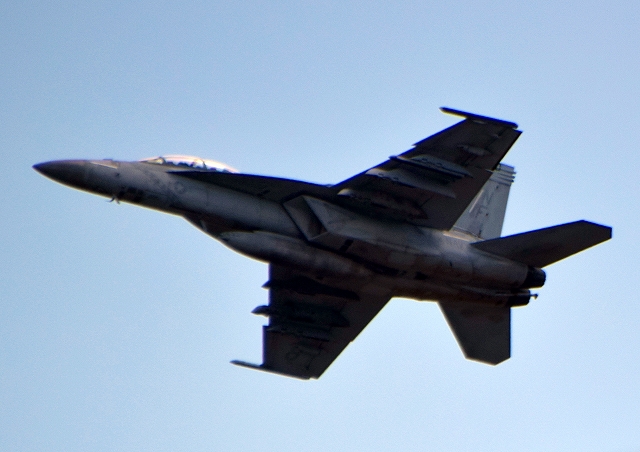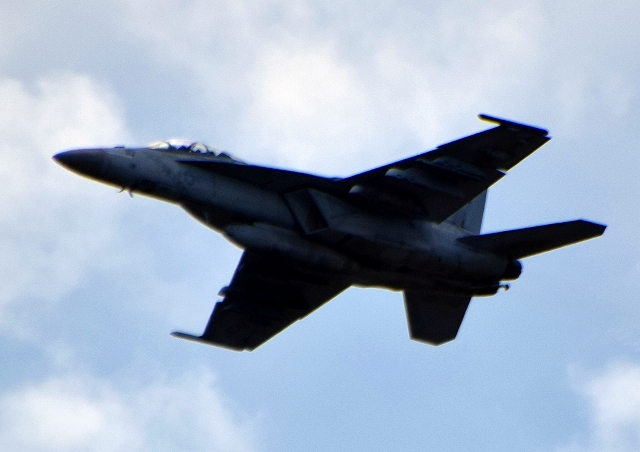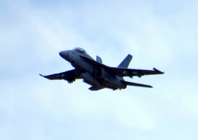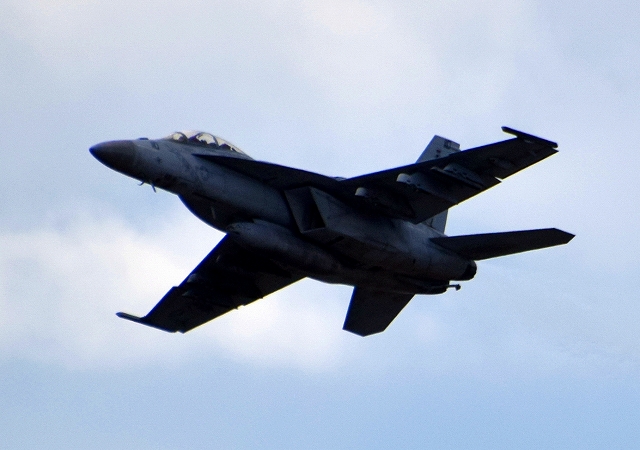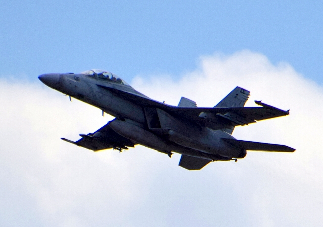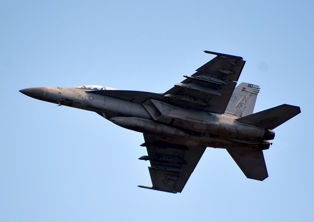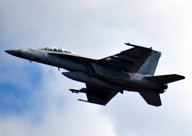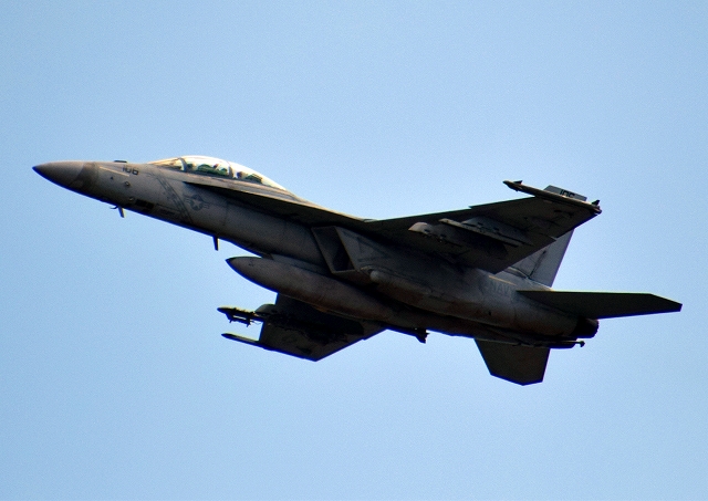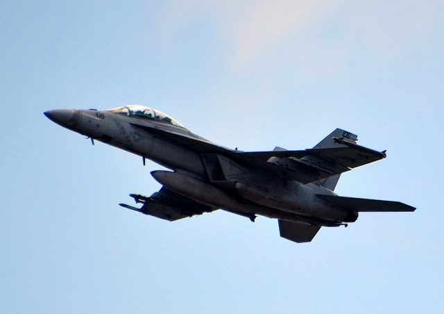 米海軍艦載機 F/A-18F スーパーホーネット 戦闘攻撃機(岩国基地)、NF、110番機が離陸 |