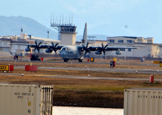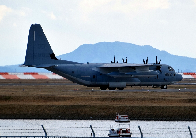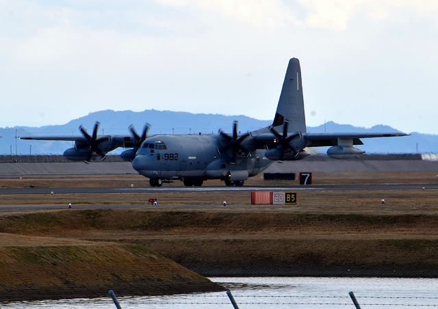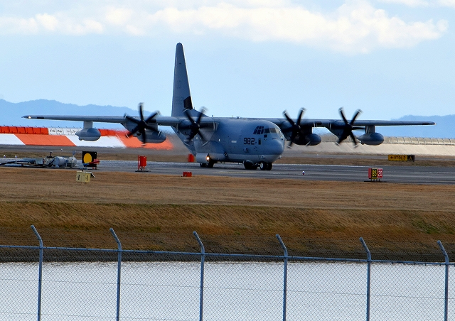 米海兵隊 KC-130J 空中給油機 スーパーハーキュリーズ(岩国基地)、QD 7982番機が着陸 |