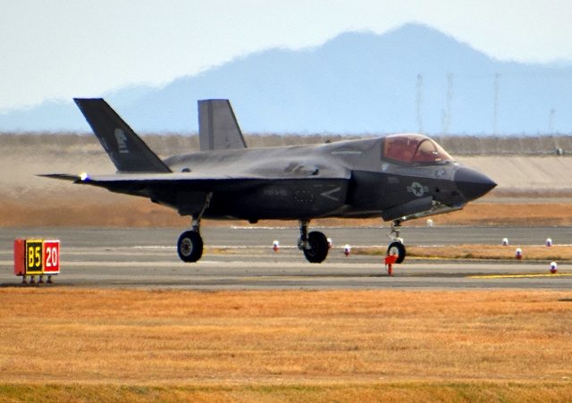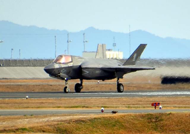 米海兵隊 F-35B ライトニングⅡ 戦闘機(岩国基地)、VK、12番機が着陸 14時08分に離陸した機。1時間08分の飛行でした。 |