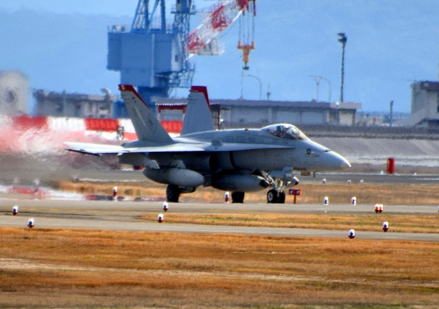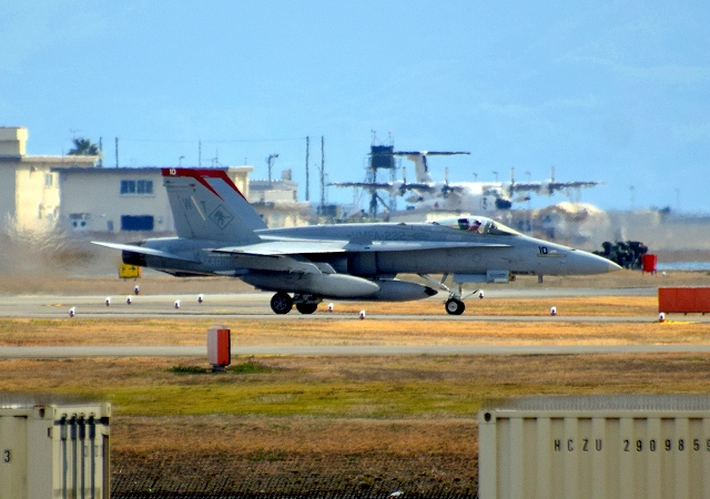 米海兵隊 F/A-18C ホーネット 戦闘攻撃機(岩国基地)、WT、10番機が着陸 |
