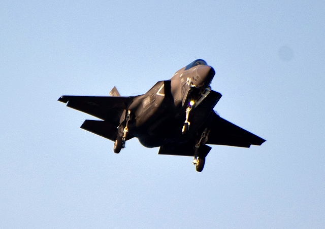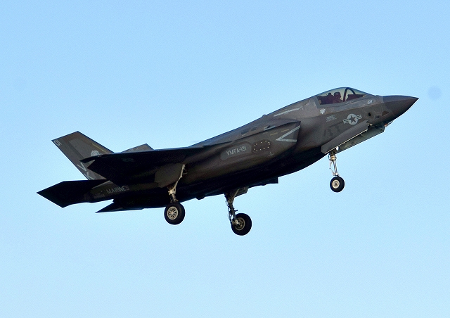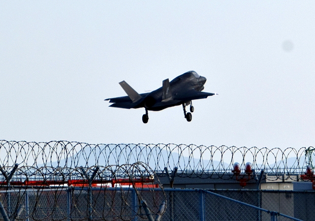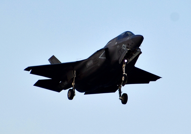 米海兵隊 F-35B ライトニングⅡ 戦闘機(岩国基地)、VK、01番機 13時55分に離陸した機。1時間49分の飛行でした。 |