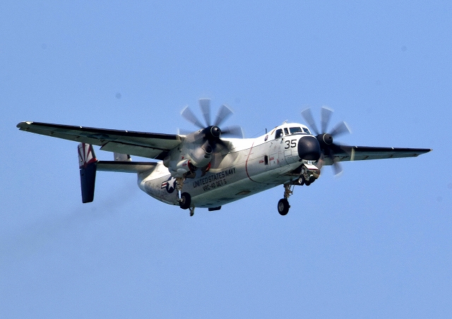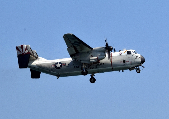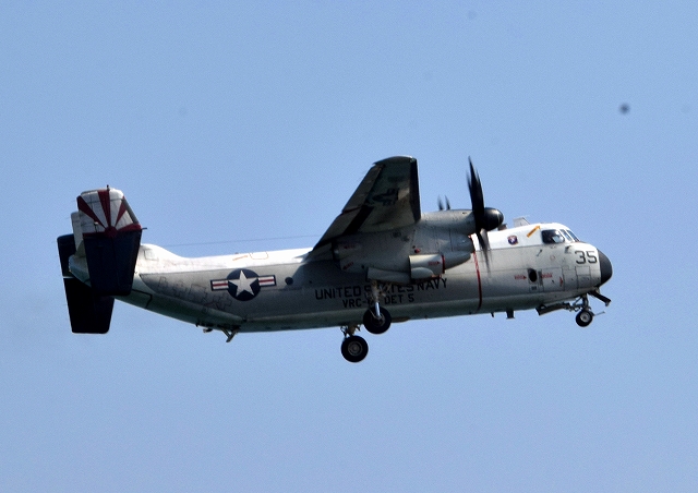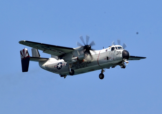 米海軍艦載機 C-2A グレイハウンド 空母連絡機(岩国基地)、35番機が旋回 |