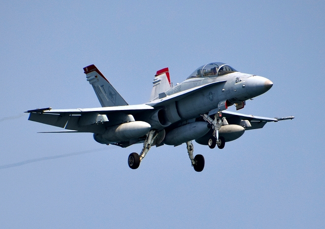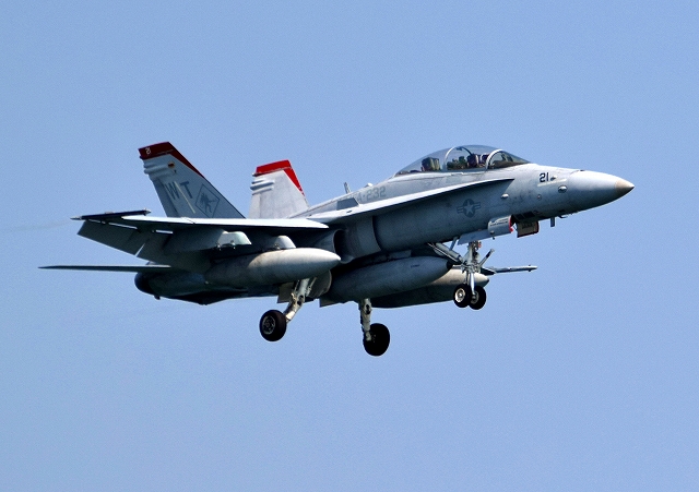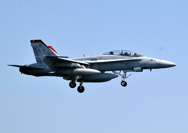 米海兵隊 F/A-18D ホーネット 戦闘攻撃機(岩国基地)、WT、21番機が着陸 |