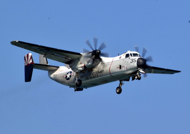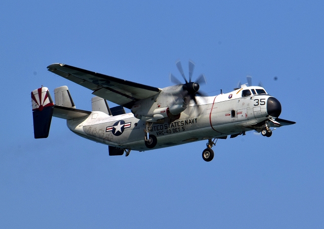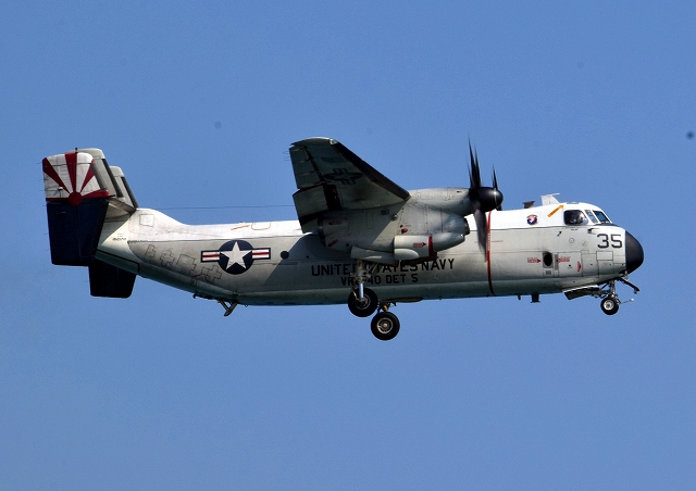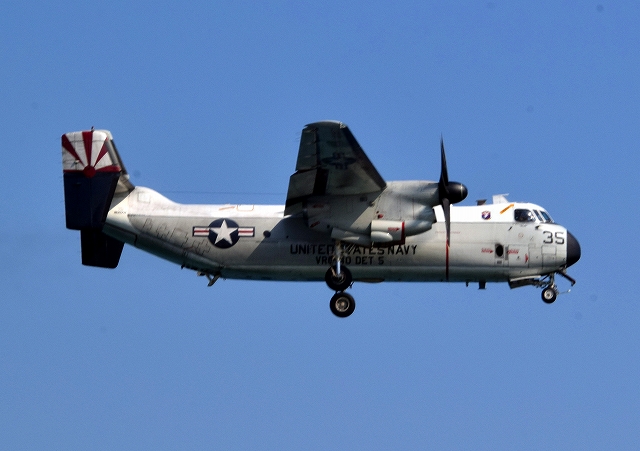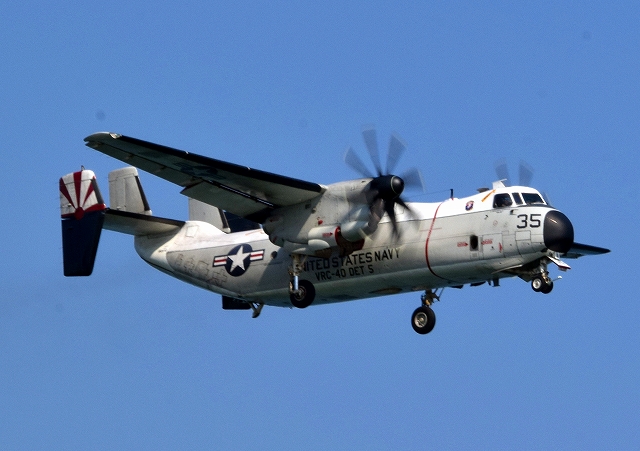 米海軍艦載機 C-2A グレイハウンド 空母連絡機(岩国基地)、35番機が旋回 |