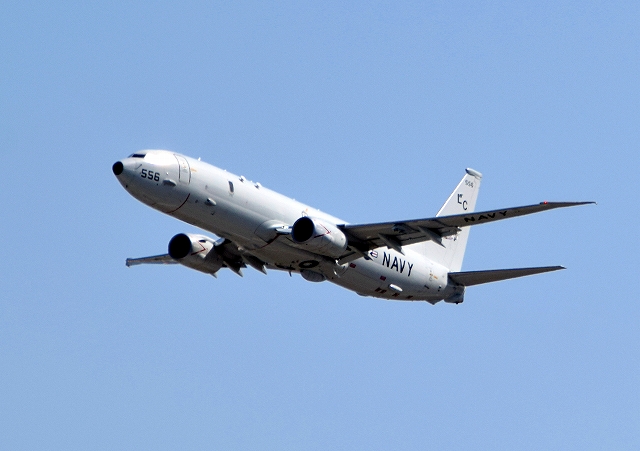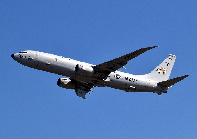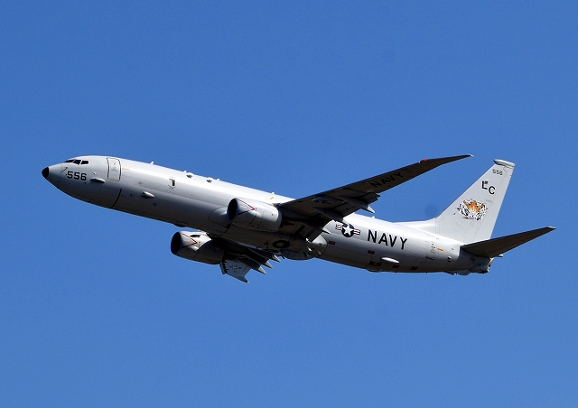 米海軍 P-8A 海上哨戒機 ポセイドン(嘉手納基地、三沢基地)、LC、556番機が旋回(14周目) |
