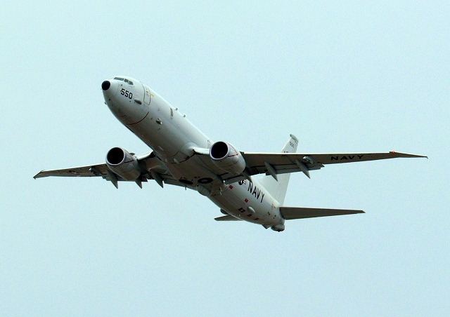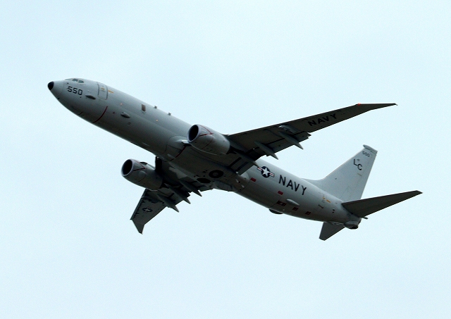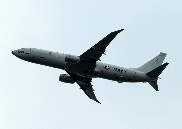 米海軍 P-8A 海上哨戒機 ポセイドン(嘉手納基地、三沢基地)、LC、550番機が旋回(1周目) |