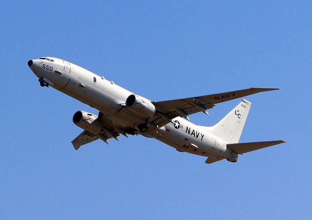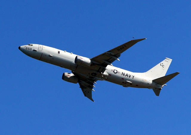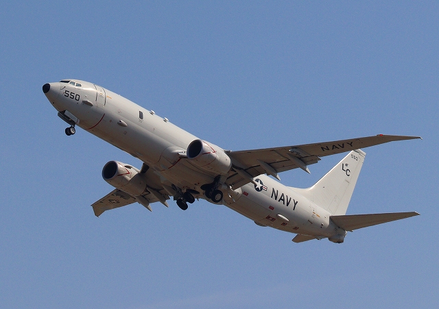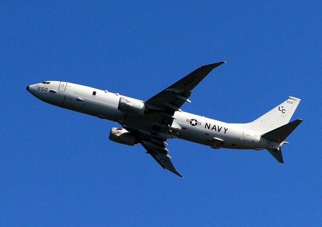 米海軍 P-8A 海上哨戒機 ポセイドン(嘉手納基地、三沢基地)、LC、550番機が旋回(9周目) |