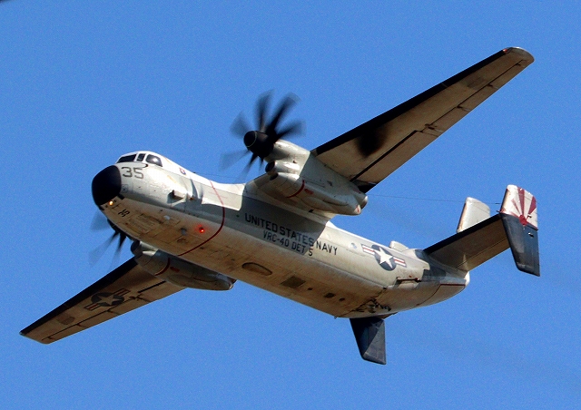 米海軍艦載機 C-2A グレイハウンド 空母連絡機(岩国基地)、35番機が旋回 |