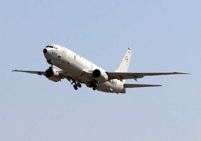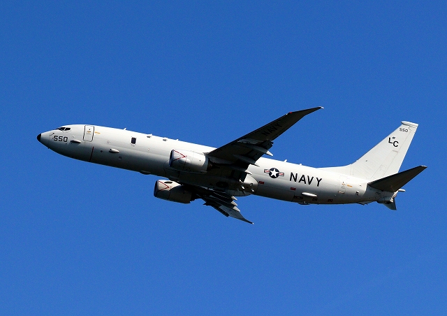 米海軍 P-8A 海上哨戒機 ポセイドン(嘉手納基地、三沢基地)、LC、550番機が旋回(10周目) |