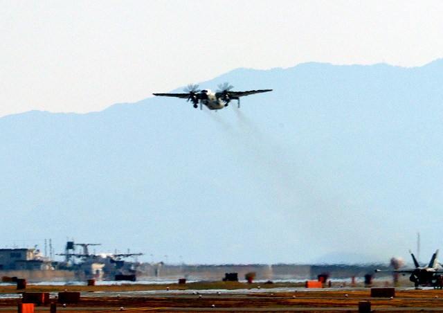 米海軍艦載機 C-2A グレイハウンド 空母連絡機(岩国基地)、35番機がタッチアンドゴーして旋回 |