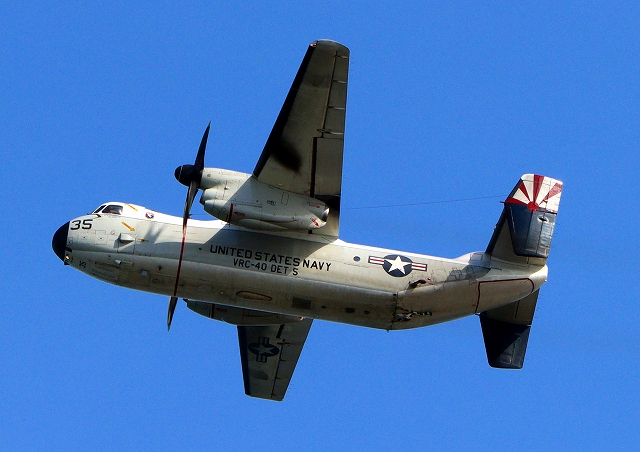 米海軍艦載機 C-2A グレイハウンド 空母連絡機(岩国基地)、35番機が旋回 |