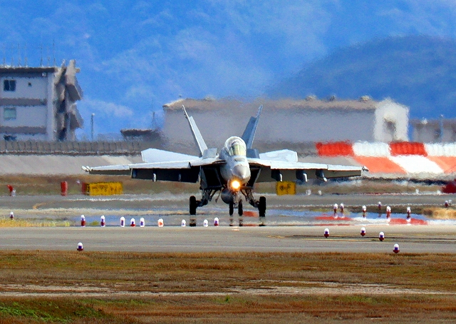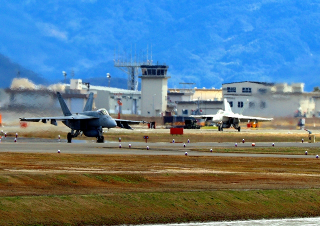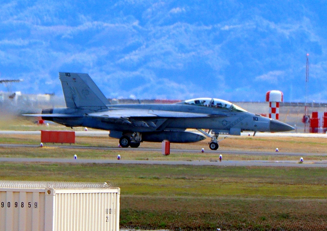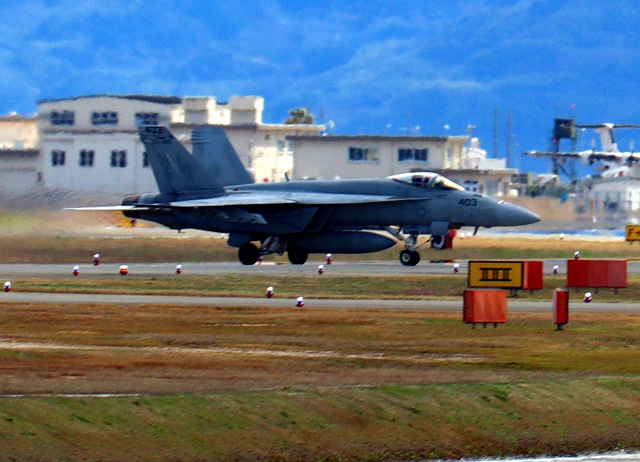 米海軍艦載機 F/A-18E スーパーホーネット 戦闘攻撃機(岩国基地)、NF、411番機が帰還 |