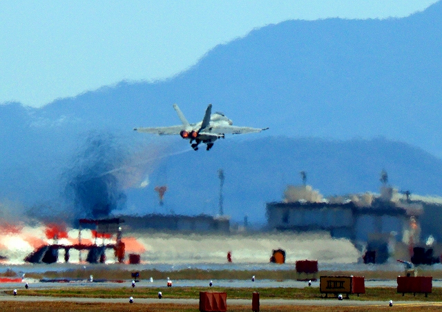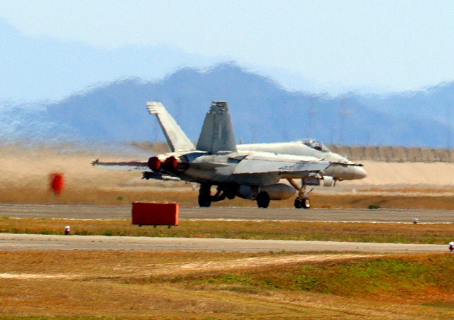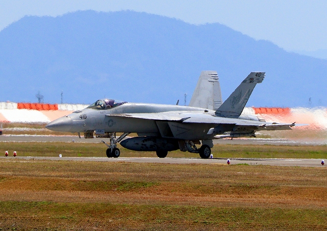 米海軍艦載機 F/A-18E スーパーホーネット 戦闘攻撃機(岩国基地)、NF、410番機が離陸 |