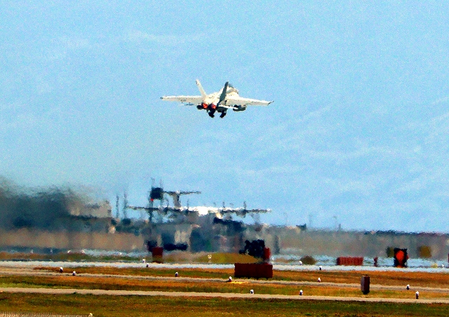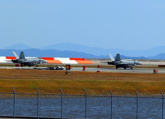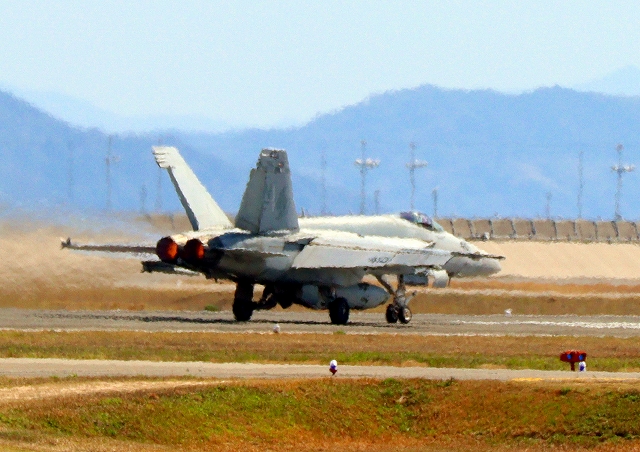 米海軍艦載機 F/A-18E スーパーホーネット 戦闘攻撃機(岩国基地)、NF、403番機が離陸 |