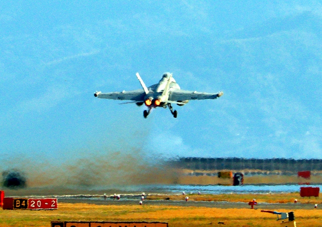 米海軍艦載機 EA-18G グラウラー 電子戦戦闘攻撃機(岩国基地)、NF、502番機が離陸 |