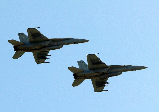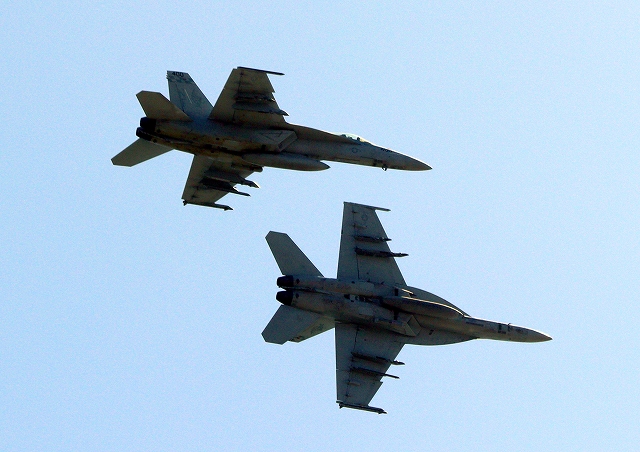 米海軍艦載機 F/A-18E スーパーホーネット 戦闘攻撃機(岩国基地)、NF、411番機、400番機が2機編隊で帰還 |
