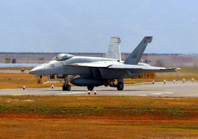 米海軍艦載機 F/A-18E スーパーホーネット 戦闘攻撃機(岩国基地)、NF、302番機が離陸 |