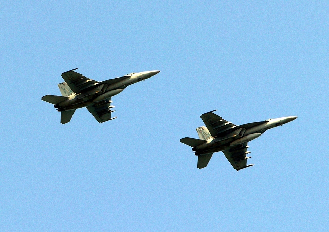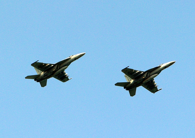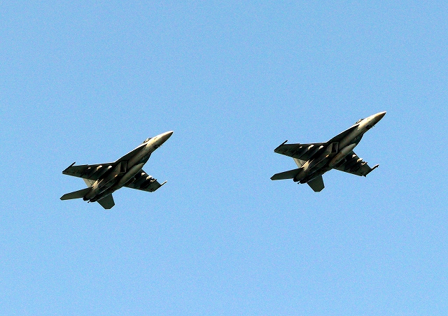 米海軍艦載機 F/A-18E スーパーホーネット 戦闘攻撃機(岩国基地)、NF、301番機、304番機が2機編隊で帰還 |
