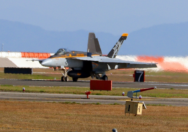 米海軍艦載機 F/A-18E スーパーホーネット 戦闘攻撃機(岩国基地)、NF、200番機が着陸 |
