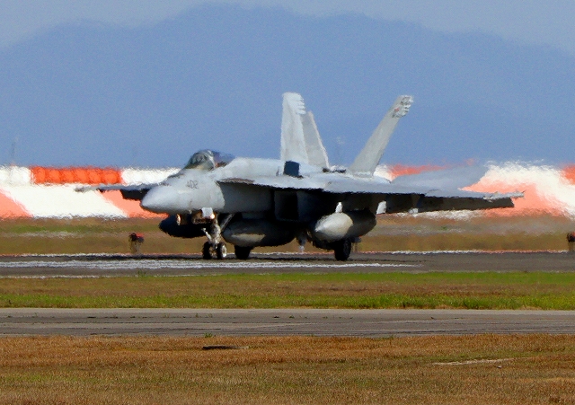 米海軍艦載機 F/A-18E スーパーホーネット 戦闘攻撃機(岩国基地)、NF、402番機が着陸 |