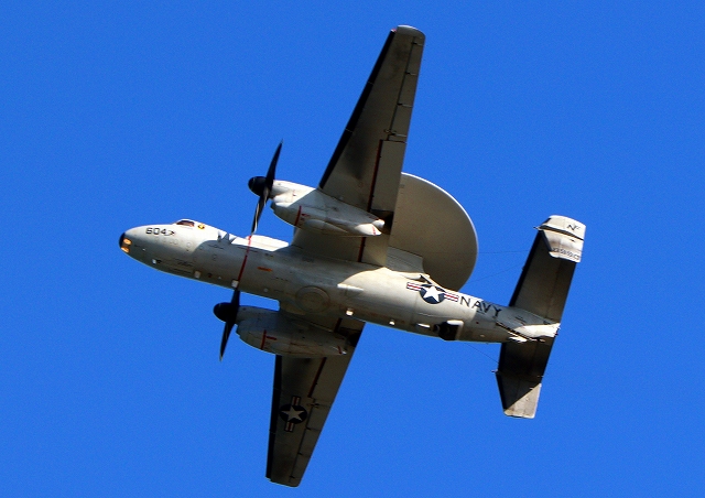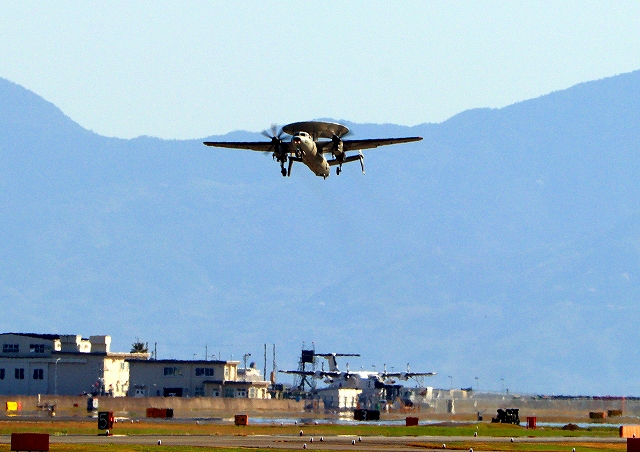 米海軍艦載機 E-2D アドヴァンスド・ホークアイ 早期警戒機(岩国基地)、604番機が離陸 |