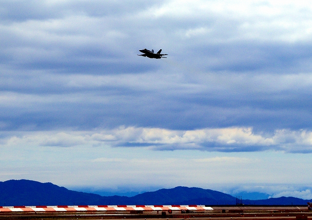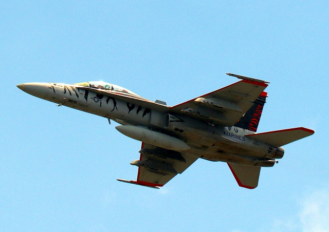 米海兵隊 F/A-18D ホーネット 戦闘攻撃機(岩国基地)、WK、01番機が離陸 |