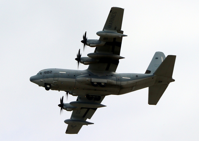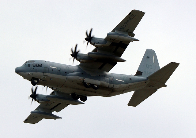 米海兵隊 KC-130J 空中給油機 スーパーハーキュリーズ(岩国基地)、QD 7982番機が旋回 |