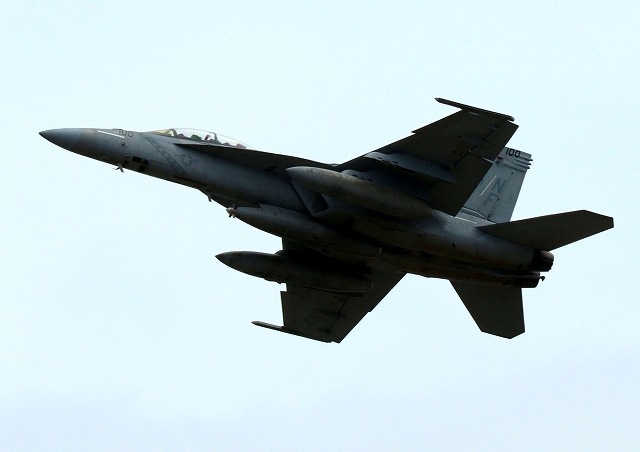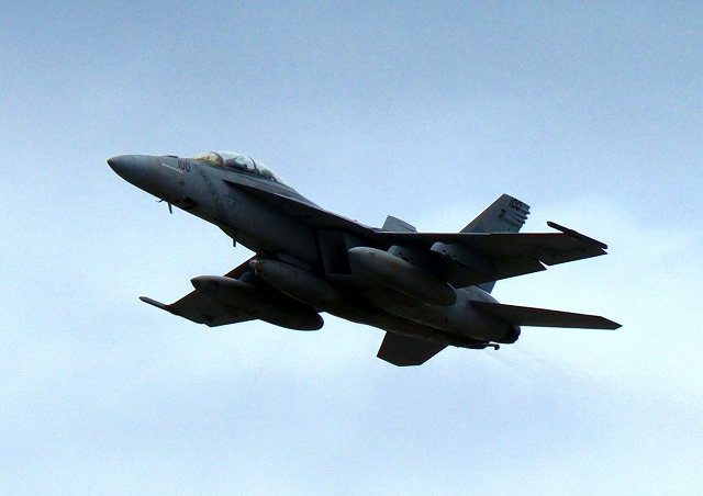 米海軍艦載機 F/A-18F スーパーホーネット 戦闘攻撃機(岩国基地)、NF、100番機が離陸 |