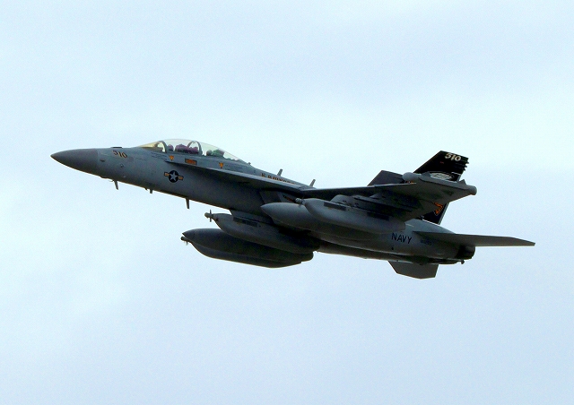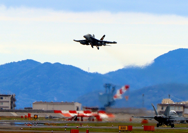 米海軍艦載機 F/A-18F スーパーホーネット 戦闘攻撃機(岩国基地)、NF、105番機が離陸 |