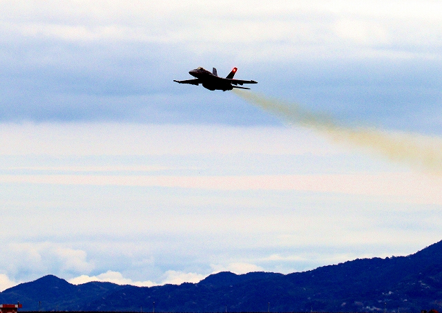 米海軍艦載機 F/A-18E スーパーホーネット 戦闘攻撃機(岩国基地)、NF、405番機が離陸 |