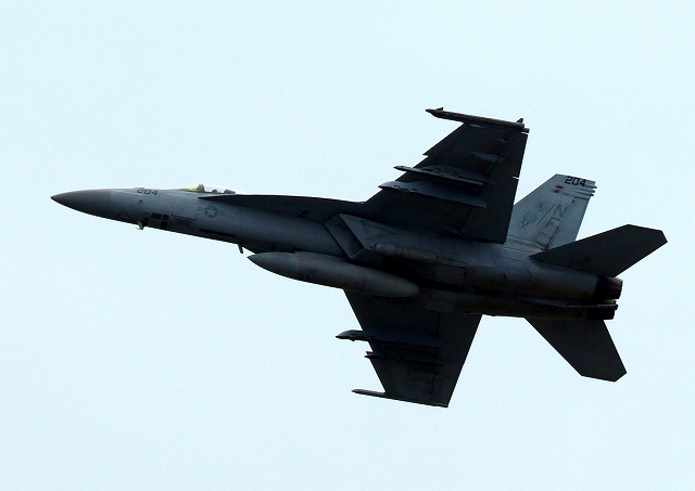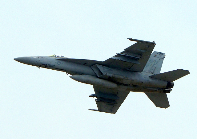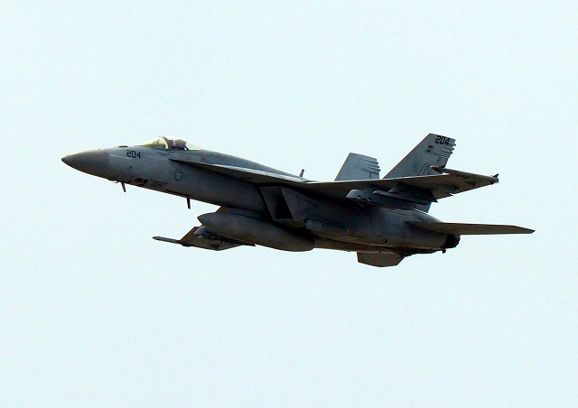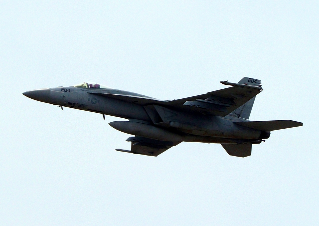 米海軍艦載機 F/A-18E スーパーホーネット 戦闘攻撃機(岩国基地)、NF、204番機が離陸 |