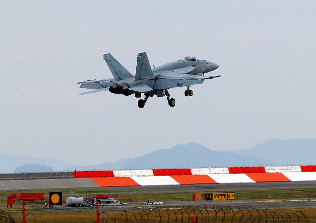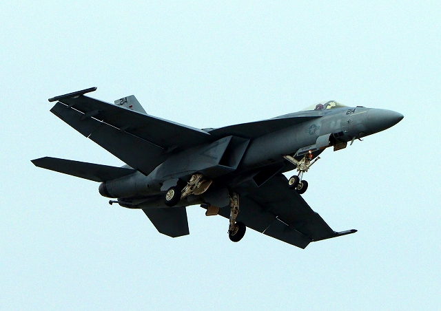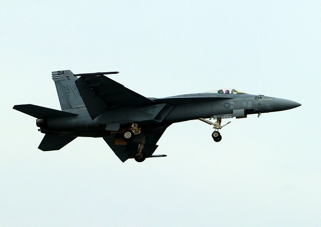 米海軍艦載機 F/A-18E スーパーホーネット 戦闘攻撃機(岩国基地)、NF、214番機が帰還 |
