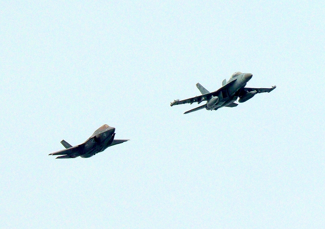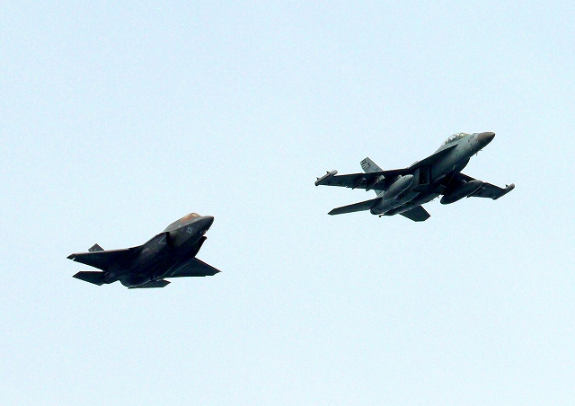 米海軍艦載機 EA-18G グラウラー 電子戦戦闘攻撃機(岩国基地)、NF、502番機、米海兵隊 F-35B ライトニングⅡ 戦闘機(岩国基地)、CE、08番機が2機編隊で帰還 |