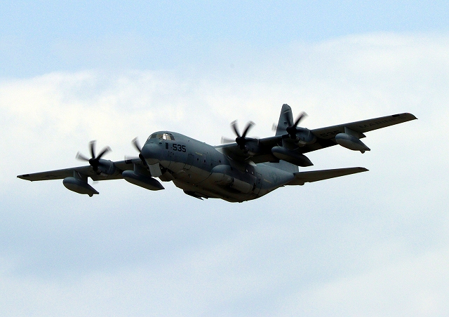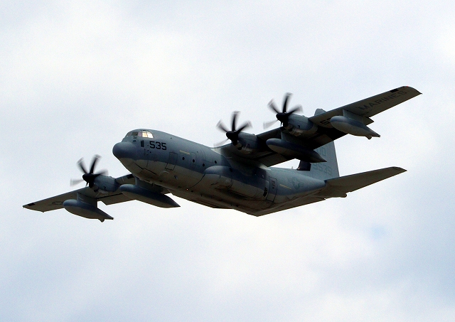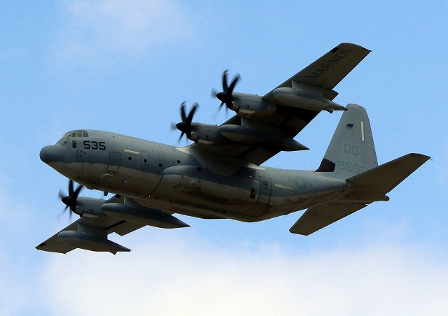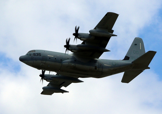 米海兵隊 KC-130J 空中給油機 スーパーハーキュリーズ(岩国基地)、QD 9535番機が離陸 |