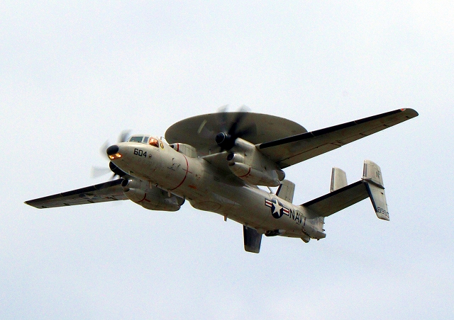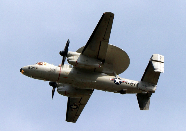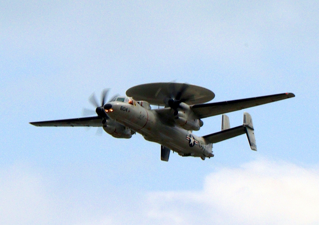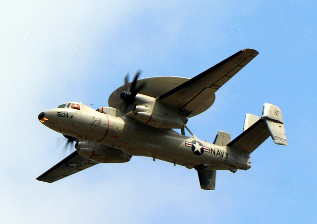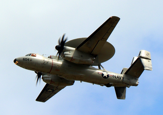 米海軍艦載機 E-2D アドヴァンスド・ホークアイ 早期警戒機(岩国基地)、604番機が旋回 |