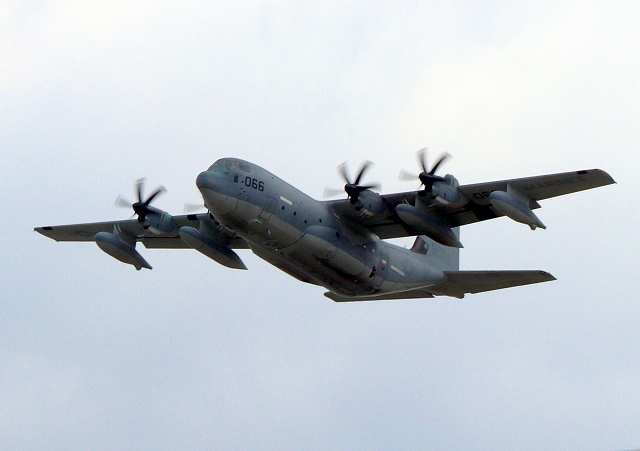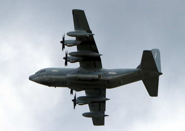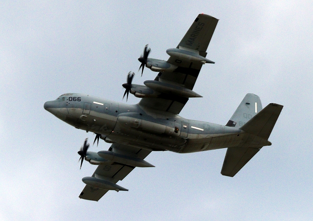 米海兵隊 KC-130J 空中給油機 スーパーハーキュリーズ(岩国基地)、QD 8066番機が離陸 |